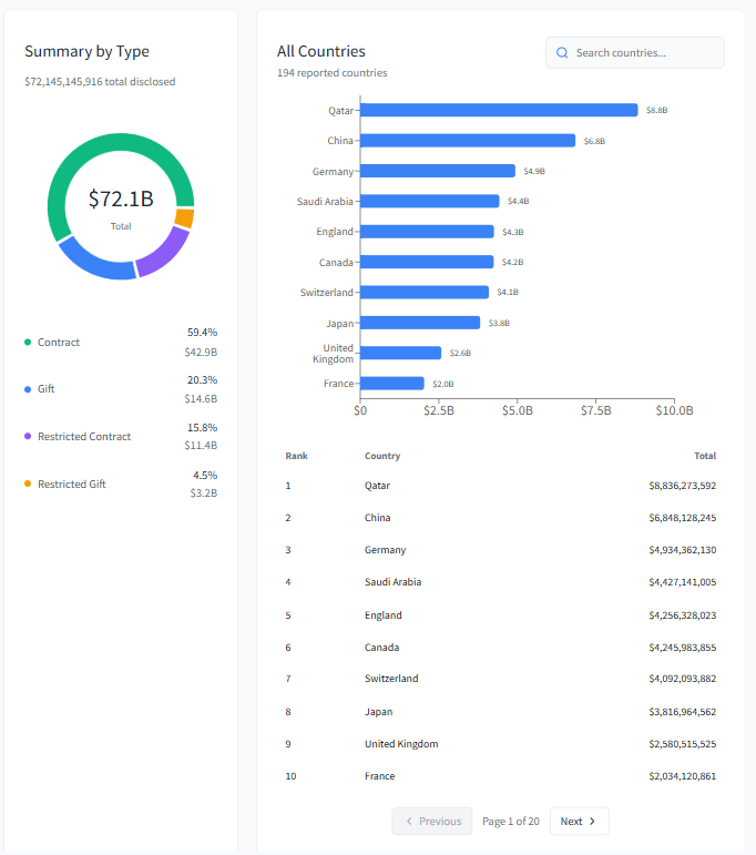 Qatar has become the dominant foreign funder of American higher education. According to Department of Education disclosures, Qatar provided $396 million to U.S. colleges and universities in 2024 and $1.2 billion in 2025—a tripling of annual investment that coincided with expanded satellite campus operations. Major universities with Education City campuses in Doha include Northwestern University, Georgetown University, Cornell University, and Carnegie Mellon University, with Qatar having channeled approximately $62.4 billion in aggregate funding to American higher education since 1986.
