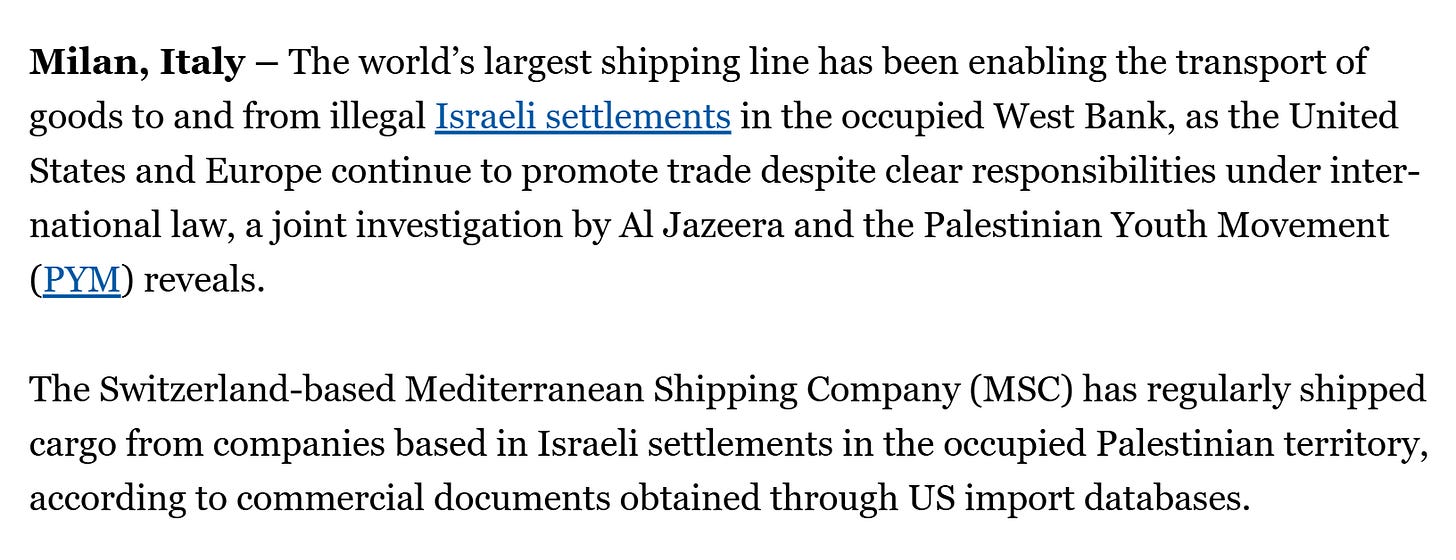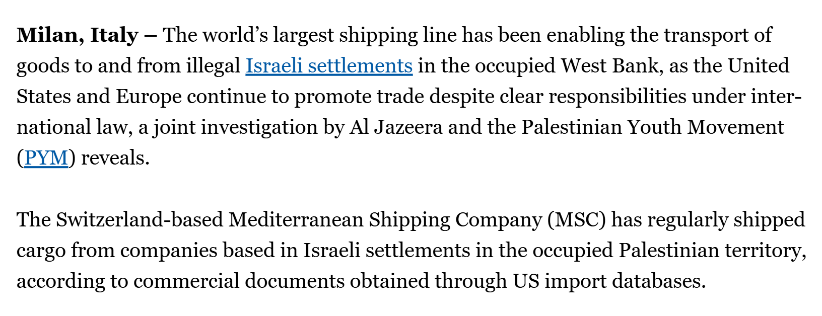 A new 26-page joint investigation published by Al Jazeera and Palestinian Youth Movement (PYM) targets the Mediterranean Shipping Company (MSC) and demands that the carrier “immediately cease all transport of goods” linked to Israeli settlements in the West Bank, arguing that failure to do so “may constitute a violation of international humanitarian law.”