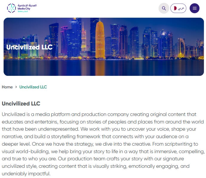 Kenan reports that LinkedIn records she examined indicate the operation’s base of operations is in Ramallah, contradicting the channel’s presentation as an independent American media project. Additionally, Kenan notes that Uncivilized LLC appears to be listed on Media City Qatar, a state-backed media hub in Doha.