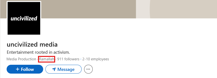However, Kenan's analysis reveals a different picture: while its YouTube channel lists its location as being in the U.S., its LinkedIn page lists its headquarters in Ramallah.