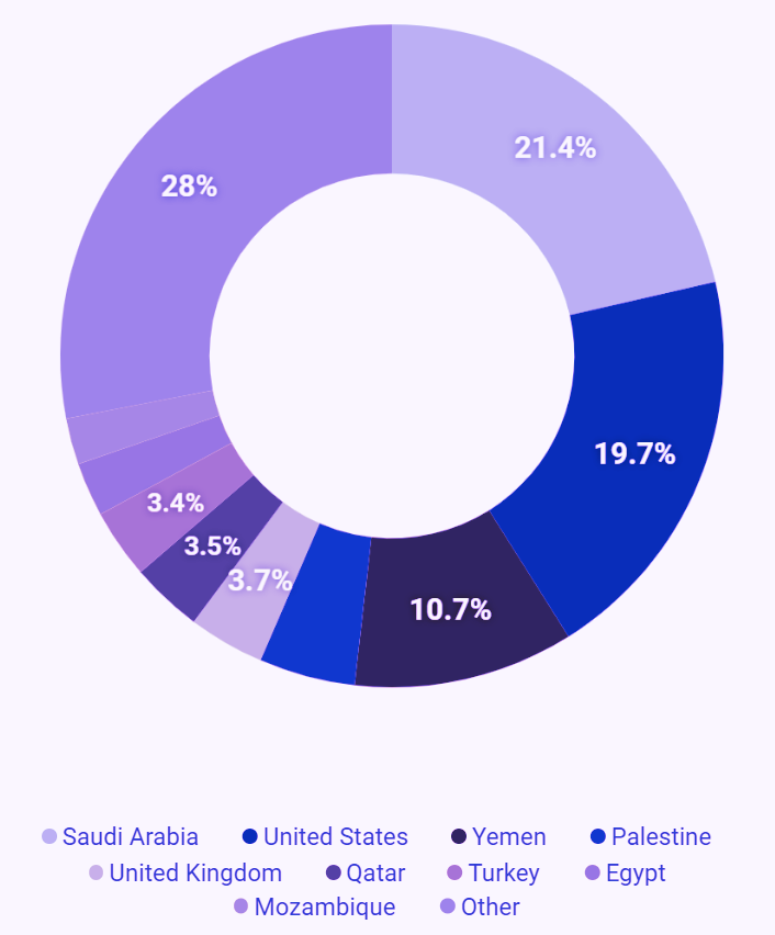 The Jewish Onliner analysis reveals the international scope of the English campaign's digital infrastructure. The predominance of Arabic-language content (47% of posts) within the English hashtag combined with significant participation from Saudi Arabia (21%), Yemen (10.7%), Qatar (3.5%), and Turkey (3.4%) indicates a concerted effort to bridge Arabic-speaking social media communities with English-language platforms.