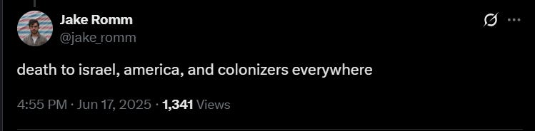 Romm has explicitly endorsed terrorist organizations, tweeting on March 27, 2025: "Hamas is the only group meaningfully working to return the hostages" and on March 7, 2025, praising the Houthis as the only group properly respecting the Genocide Convention. He has called for “death to israel, america, and colonizers everywhere” on his social media.