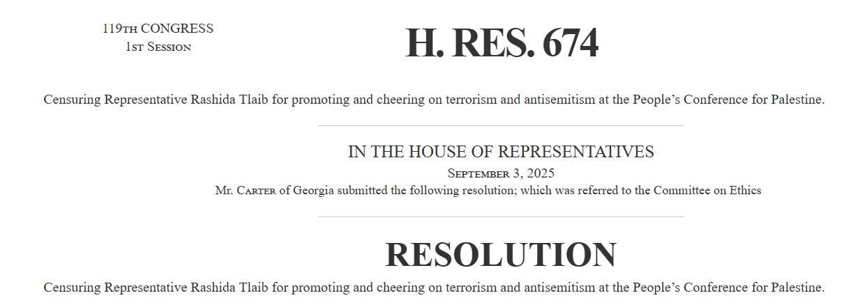 The report documents instances spanning from 2019 through August 2025, when Tlaib served as a keynote speaker at the People’s Conference for Palestine in Detroit, an event that also featured calls for political leaders to be “neutralized” and speakers defending Hamas’s October 7 attacks.