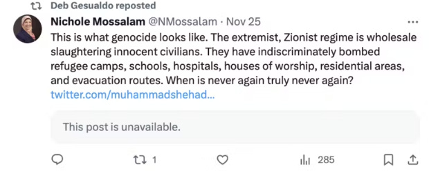 The MTA's board of directors, which represents 117,000 teachers, faculty, and other professional staff members at Massachusetts public schools and universities, voted in favor of a statement accusing the U.S. government of being complicit in a "genocidal assault" on Gaza. The statement provided no condemnation of Hamas’ October 7 attacks, which targeted Israeli civilians. The statement was submitted by Joe Herosy, a retired music teacher from Quincy, Massachusetts, and seconded by Deborah Gesualdo, a current music teacher and president of the Malden Educators Association. Gesualdo previously retweeted a post on X that claimed the “extremist, Zionist regime is wholesale slaughtering innocent civilians.”