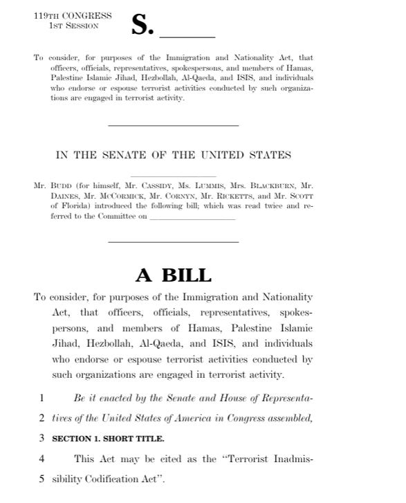 I just wrote to my two U.S. Senators in Texas asking them to support S.3237 when its text is uploaded to Congress- "A bill to consider, for purposes of the Immigration and Nationality Act, that officers, officials, representatives, spokespersons, and members of Hamas, Palestine Islamic Jihad, Hezbollah, Al-Qaeda, and ISIS, and individuals who endorse or espouse terrorist activities conducted by such organizations are engaged in terrorist activity."