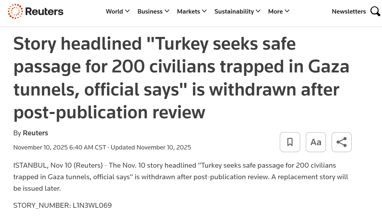 Reuters replaced the article with a brief notice: “The Nov. 10 story headlined ‘Turkey seeks safe passage for 200 civilians trapped in Gaza tunnels, official says’ is withdrawn after post-publication review. A replacement story will be issued later.”