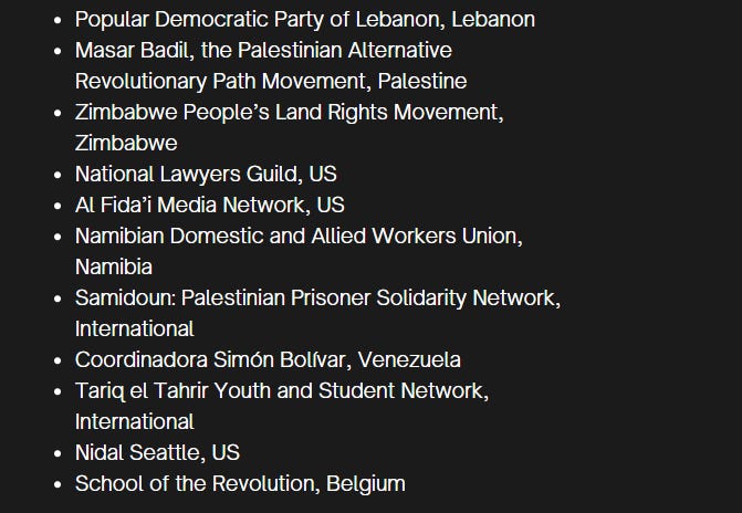In addition to Samidoun and several other closely aligned groups listed on the resolution, the statement drew endorsements from a range of U.S.-based organizations. These include National Students for Justice in Palestine, which operates under the fiscal sponsorship of the WESPAC Foundation, the National Lawyers Guild, a 501(c)(4) nonprofit, as well as the United States Peace Council and the International Action Center, which describes itself as a grassroots anti-war organization.