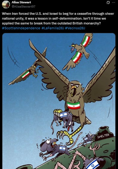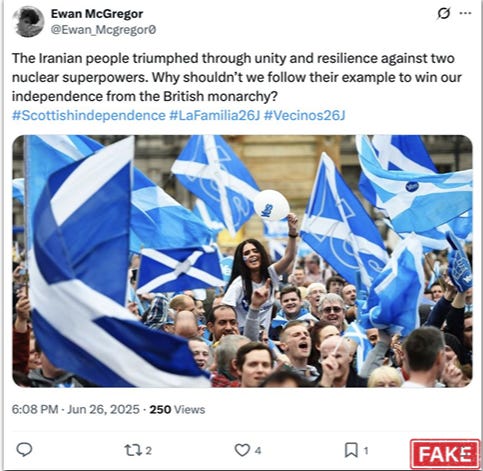 The simultaneous maintenance of anti-British and pro-Iranian content revealed the operation's sophisticated approach to narrative integration. By continuing Scottish independence messaging alongside Iranian propaganda, the network sought to draw parallels between Scotland's independence movement and Iran's confrontation with Western powers.