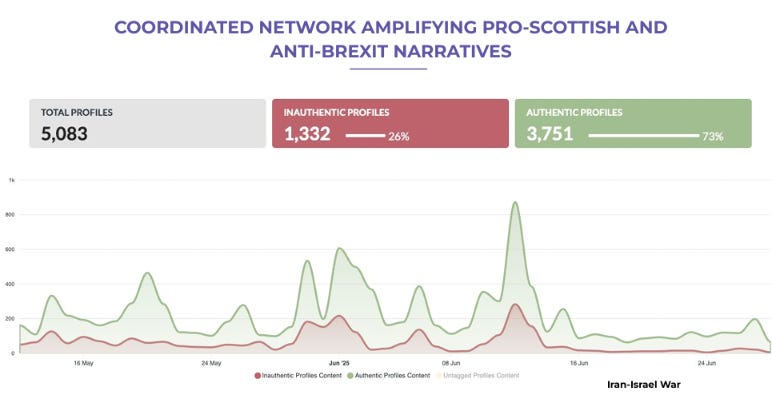 The network's exposure came through an unexpected vulnerability: Iran's nationwide blackout on June 13, 2025. Following an Israeli military operation against Iranian infrastructure, researchers observed a remarkable pattern. Hundreds of previously active social media accounts promoting Scottish independence simultaneously went silent for exactly 16 days.