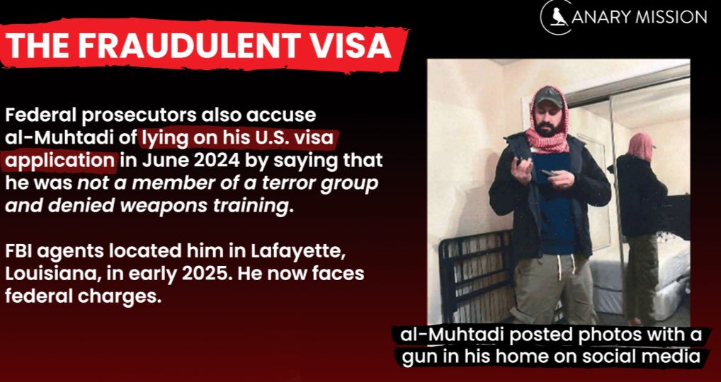 Al-Muhtadi’s path to the United States exposes critical failures in visa screening procedures. In June 2024, while living in Cairo, Egypt, he submitted an electronic U.S. visa application. On the application, he explicitly denied any involvement with paramilitary organizations, any connections to Hamas, any participation in terrorist attacks, and any military training.