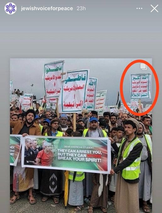 JVP’s social media posts have amplified extremist propaganda, including sharing the Houthi terror group’s infamous slogan, “God is great, death to the U.S., death to Israel, curse the Jews, and victory for Islam.”