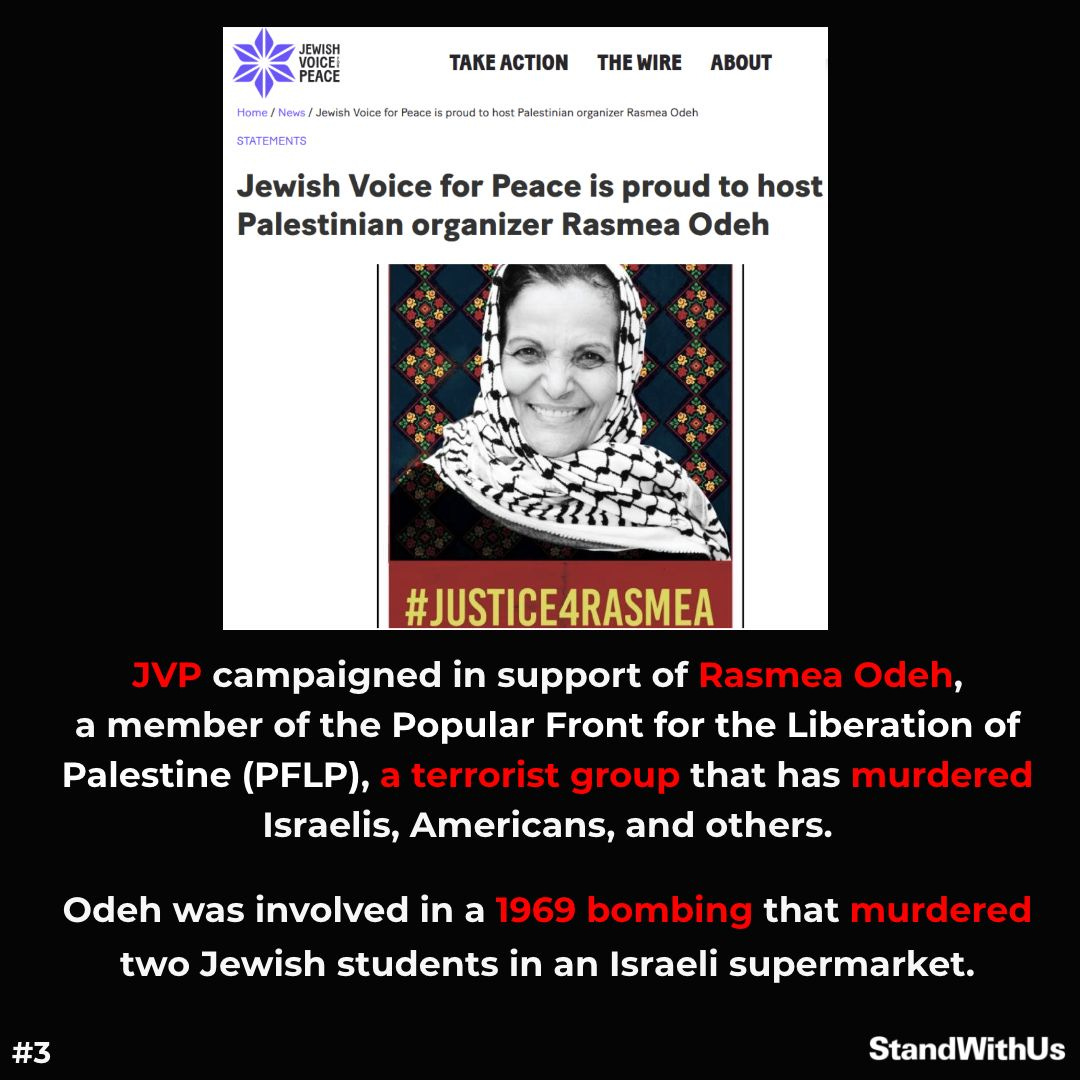 JVP has a documented history of collaborating with U.S.-designated terrorist organizations. It has repeatedly partnered with members of the Popular Front for the Liberation of Palestine (PFLP), which has carried out numerous attacks, including the infamous Lod Airport Massacre that killed 26 people, 17 of them U.S. citizens. JVP celebrated the release of PFLP member Khalida Jarrar from Israeli custody, co-hosted a webinar with PFLP hijacker Leila Khaled, and campaigned in support of PFLP member and convicted murderer, Rasmea Odeh, who helped execute a supermarket bombing in Jerusalem that killed two students.