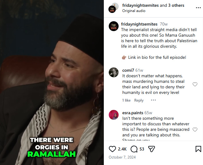 The same podcast account, @fridaynightsemites on Instagram, published a video segment in October 2024 titled “Gay Orgies in Ramallah” featuring Mama Ganuush.