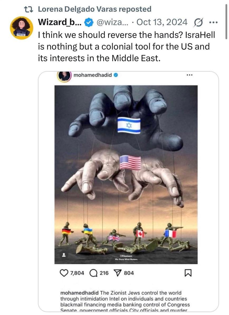 The image, which Delgado Varas shared on social media, was reposted from the account of Bisan Owda, a known member of the Popular Front for the Liberation of Palestine (PFLP), a designated terrorist organization by the European Union. The cartoon has been characterized by multiple watchdogs and Jewish organizations as evoking classic antisemitic tropes, including themes of blood libel and Jewish global domination.