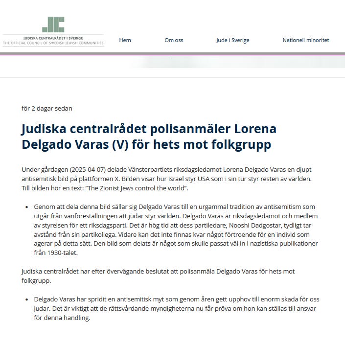 The incident has drawn a formal police complaint from Sweden’s central Jewish representative body, Judiska Centralrådet, accusing Delgado Varas of incitement against an ethnic group under Swedish law.