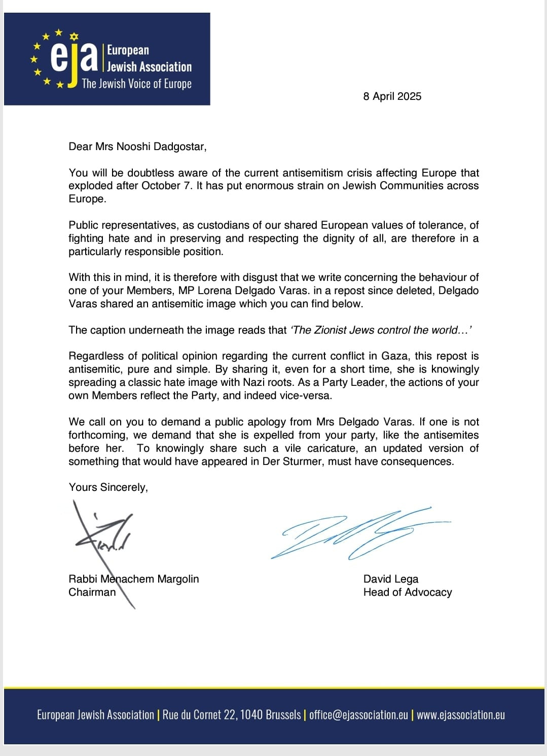 “We have not yet received a direct response from Nooshi Dadgostar,” said David Lega, EJA’s Senior Adviser for Scandinavia, “As of now, we are also not aware of any official statement from her addressing the significant public concern surrounding this issue.” “It seems likely that she is behind Delgado Varas’s recent pause from assignments—a step we acknowledge—but that alone is far from sufficient given the gravity of what was shared,” he added.