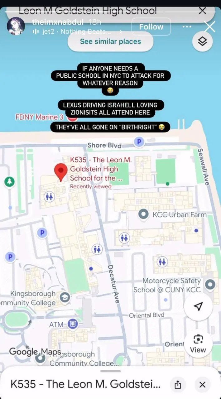Abdul's post included the school's Google Maps location with a caption reading: "If anyone needs a public school in NYC to attack for whatever reason ... Lexus driving Israhell loving Zionisits all attend here." The post specifically referenced the school's students and their participation in Birthright, a program offering free trips to Israel for young Jewish adults.