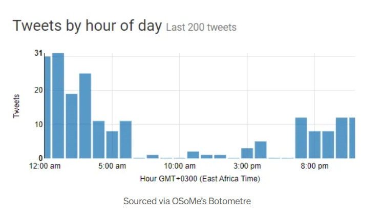 Independent researcher Dan Smith analyzed SICS’s posting patterns using Twitter analytics tools and found the account’s activity peaks between 1 a.m. and 6 a.m. East Africa Time — the middle of the night in Somalia, but daytime business hours in China. “While not proving that someone inside China is running the account, this is wildly inconsistent with what posting would look like if they were based in Somalia,” Smith wrote in an August 2023 exposé.