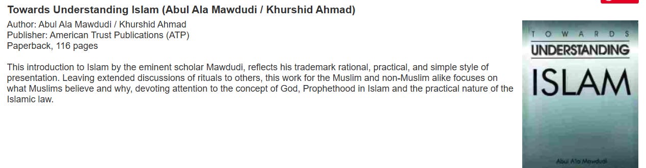 The catalog also includes books by Syed Abul Ala Maududi, the Pakistani Islamist who founded Jamaat-e-Islami and advocated for Islamic state governance. Maududi’s ideology paralleled the Muslim Brotherhood’s, calling for the complete Islamization of society and the establishment of sharia-based government systems.