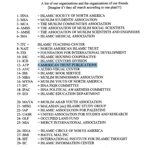 American Trust Publications (ATP) is listed as organization #12 in the Muslim Brotherhood’s 1991 “Explanatory Memorandum,” which enumerates groups described as part of the Brotherhood’s network in North America. Some researchers interpret ATP’s role in that ecosystem as a publishing vehicle for disseminating extremist-aligned ideology.