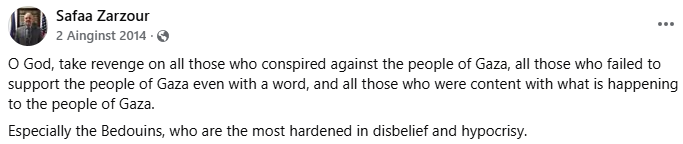 In August 2014, Zarzour posted on Facebook: "O God, take revenge on all those who conspired against the people of Gaza...Especially the Bedouins, who are the most hardened in disbelief and hypocrisy."