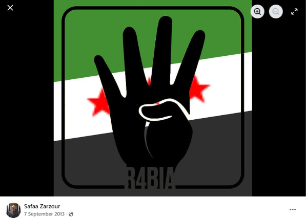 Zarzour has also publicly displayed the four-fingered “Rabia” symbol on social media, which researchers at George Washington University’s Program on Extremism identify as “a gesture of support for the Muslim Brotherhood.”