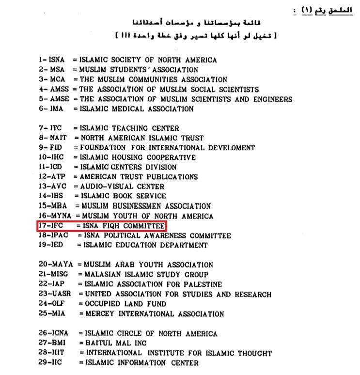 However, the organization seemingly serves as the jurisprudential authority for groups that appeared on a controversial 1991 Muslim Brotherhood memo. That memo listed Brotherhood organizations and their offshoots, and outlined what it described as a "grand Jihad in eliminating and destroying Western civilization from within." The Fiqh Council of America appears as number 17 on the MB list under its previous name— ISNA Fiqh Committee (IFC).