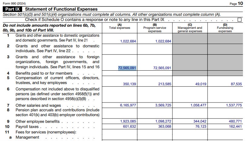 The same 2024 Form 990 discloses $72,565,091 in “grants and other assistance to foreign organizations, foreign governments, and foreign individuals.” Schedule F lists activity across South Asia, the Middle East and North Africa, Sub-Saharan Africa, Europe, East Asia and the Pacific, North America, South America, Central America and the Caribbean, and Russia and neighboring states.