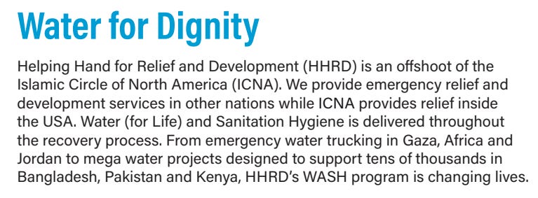Helping Hand for Relief and Development was not in existence when the 1991 Muslim Brotherhood memorandum listed the Islamic Circle of North America as organization No. 26. However, HHRD’s own records place it within ICNA’s later institutional orbit. In a 2025 WASH (water, sanitation, and hygiene) report, HHRD stated: “Helping Hand for Relief and Development (HHRD) is an offshoot of the Islamic Circle of North America (ICNA). We provide emergency relief and development services in other nations while ICNA provides relief inside the USA.”