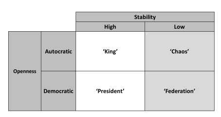 For scenarios involving a new regime, the analysis cross-references stability and openness to identify four alternatives: