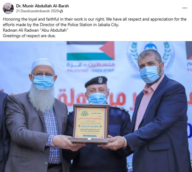 A telling piece of evidence is a photograph of Alboursh presenting an award to the director of the Jabalia Police Station. The award prominently features the Hamas logo, clearly establishing Alboursh as a representative of the terror group.