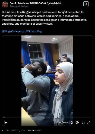 The growing tensions on university campuses were on full display at a recent KCL event titled "From Conflict to Connection: Israelis and Iranians in Dialogue." Anti-Israel activists disrupted the talk, forcing Iranian activist Faezeh Alavi to leave under security protection. As protesters shouted slogans and shut down the discussion, the event was cut short—another example of how radical elements are using intimidation tactics to silence perspectives they oppose.