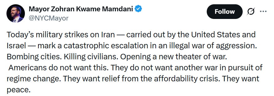 New York City Mayor Zohran Mamdani, a prominent member of the Democratic Socialists of America (DSA), has also drawn scrutiny for his condemnation of the operation. Several years ago, Mamdani publicly identified as a “Twelver” (Ithna-Asheri) — the same Shia sect that forms the theological backbone of the Iranian regime. Following the launch of Operation Epic Fury, he stated that “Today’s military strikes on Iran — carried out by the United States and Israel — mark a catastrophic escalation in an illegal war of aggression.” The DSA, for its part, officially maintains stated that it “Stands against Imperialist War and with the Iranian People.”