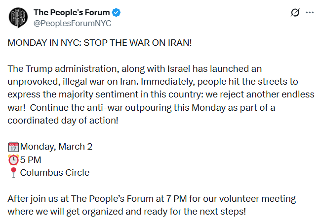 The most organized opposition comes from The People’s Forum, an organization heavily funded by Neville Roy Singham, a tech mogul with documented links to Chinese Communist Party propaganda networks. Multiple congressional offices have called for an investigation into Singham’s network for its alleged links to the Chinese government. The People’s Forum has been organizing rallies to “defend Iran,” framing the death of Khamenei as a loss for the “global south.”