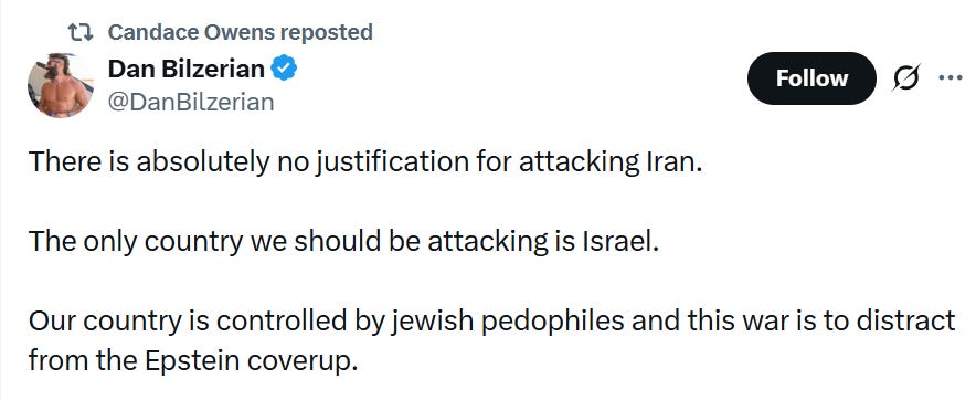 This alliance was further exemplified by conspiracy theorist Candace Owens, who shared a post stating, “There is absolutely no justification for attacking Iran.