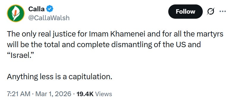 Meanwhile, radical anti-Israel activist Calla Walsh openly called for the “complete dismantling of the US and Israel” as “the only real justice” for Khamenei’s death.