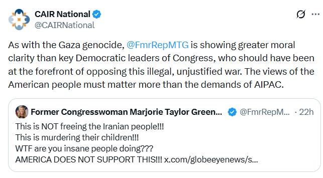 Greene had slammed the operation, criticizing the strike and asking, “WTF are you insane people doing???” CAIR quote tweeted the sentiment, praising the former congresswoman saying, “As with the Gaza genocide, [Majorie Taylor Greene] is showing greater moral clarity than key Democratic leaders of Congress.”