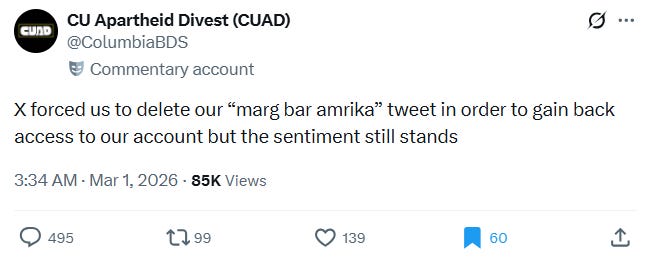 Over on campus, the Columbia University Apartheid Divest (CUAD) coalition posted “Death to America” on X in Farsi.