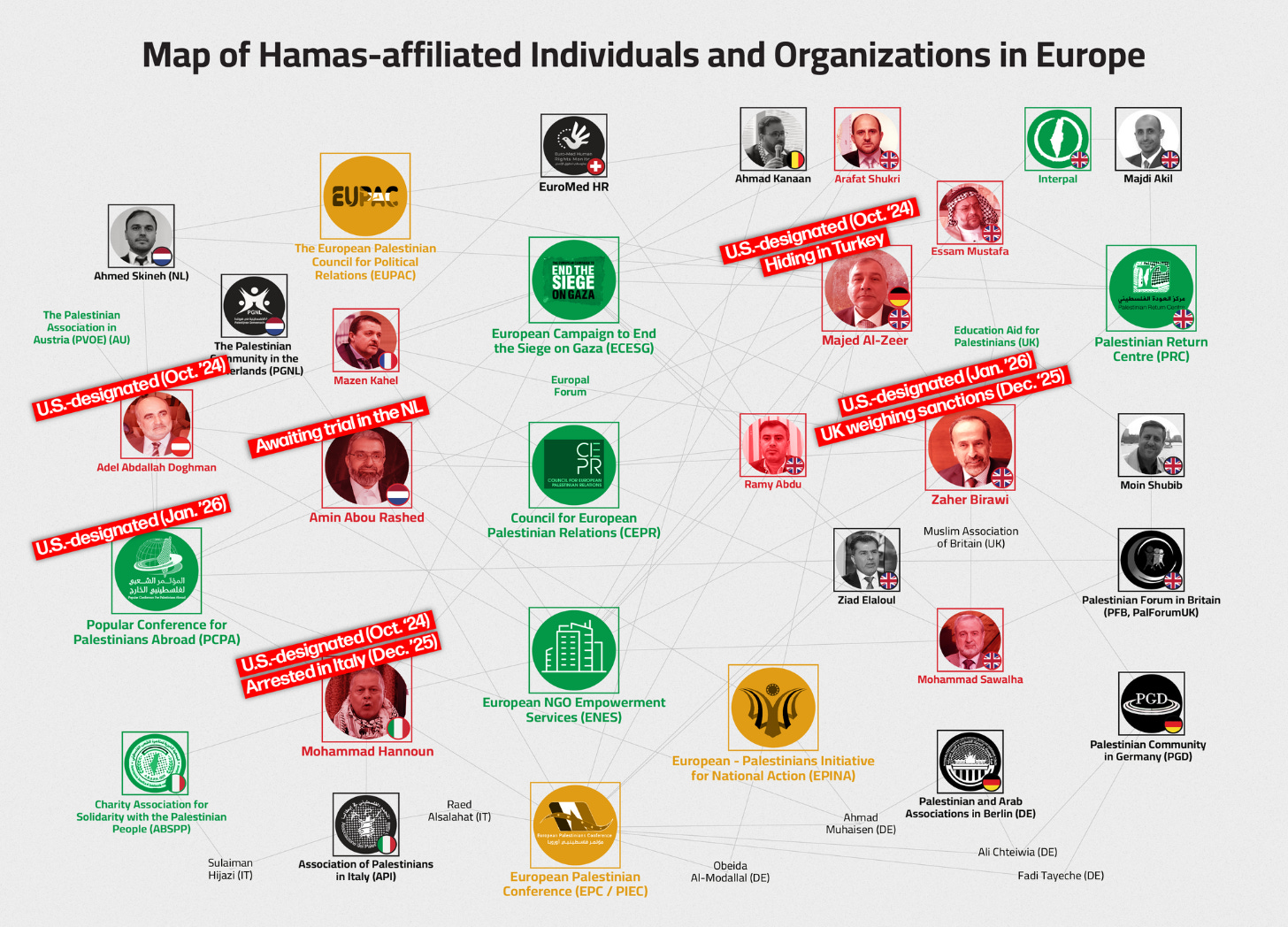 Two individuals previously designated by Treasury in October 2024—Adel Saad al-Din Hassan Doughman and Majid Khalil Moussa al-Zeer—held prominent PCPA positions while simultaneously serving as senior Hamas representatives in Europe. Doughman led Hamas efforts in Austria, while al-Zeer served as PCPA Chairman and oversaw Hamas fundraising operations across Europe from Germany.