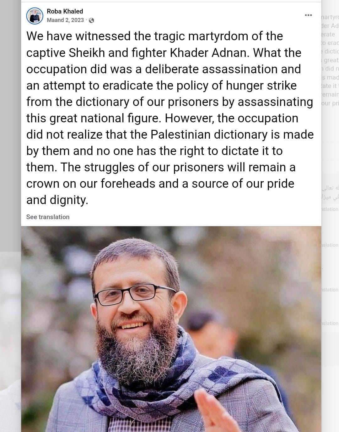 In a post from May 2023, Khaled mourned the death of Khader Adnan, describing him as a "martyr" and "fighter prisoner," characterizing his death as a "deliberate assassination" by Israeli forces. Adnan was a senior official in the U.S.-designated terror group, Palestinian Islamic Jihad (PIJ).