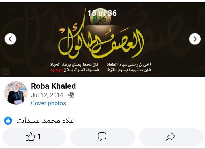 In a post published during Operation Protective Edge, a 2014 conflict between Israel and Hamas, Khaled shared propaganda images from Hamas’ Qassam Brigades, including images bearing its official logo.