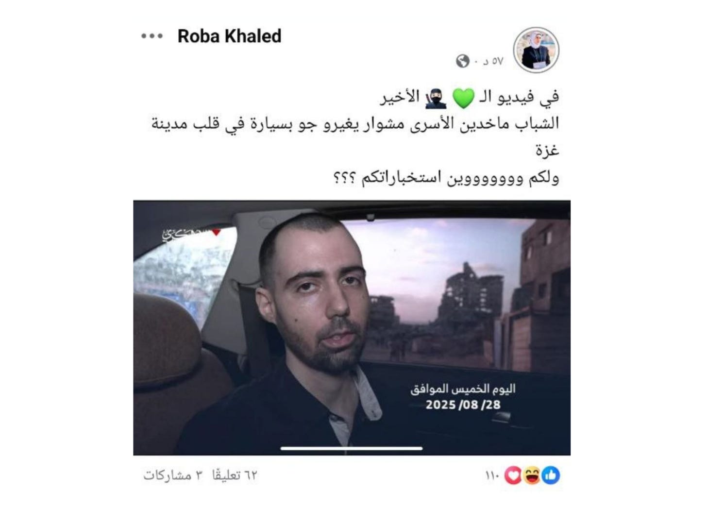 Roba Khaled, a correspondent for Turkish state broadcaster TRT, mocked Israeli intelligence agencies on Facebook following the release of a Hamas propaganda video featuring Israeli hostage Guy Gilboa Dalal, taunting Israel for not yet securing his freedom from captivity. Khaled’s Facebook post, originally discovered by X user Ph.Gritti, reads: "In the last video, the guys took the prisoners out for a ride in a car in the heart of Gaza City. And where on earth is your intelligence?"