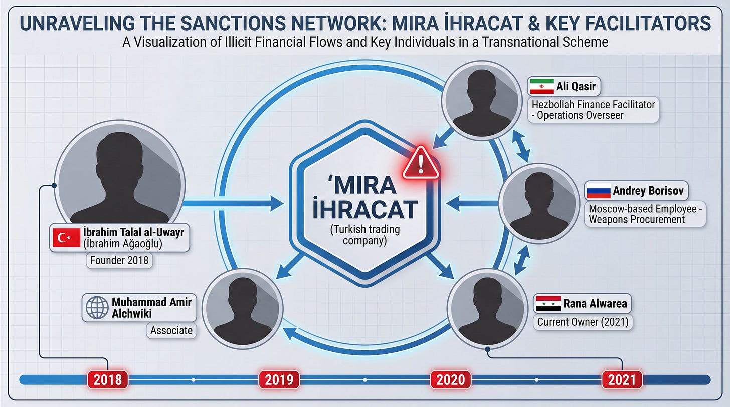 A central node in the network is Mira İhracat İthalat Petrol Ürünleri Sanayi Ticaret Limited Şirketi, a Turkish trading company first sanctioned by OFAC in January 2024 for purchasing, transporting, and selling Iranian commodities on behalf of the IRGC-QF and Hezbollah financial operatives. Despite that designation, the company’s infrastructure continued to be leveraged by sanctioned actors.
