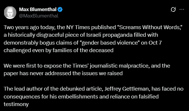 Notably, journalists associated with The Grayzone, Al Jazeera, and Drop Site News have been particularly vocal in amplifying the campaign. Max Blumenthal called the article “historically disgraceful Israeli propaganda,” while Aaron Maté described it as “atrocity propaganda used to manufacture consent for genocide.” Laila Al-Arian, executive producer of Al Jazeera Fault Lines, characterized it as a “disaster.”
