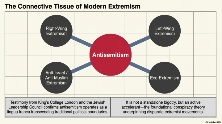 The Committee heard testimony from Dr. Daniel Allington, Reader in Social Analytics at King’s College London, who characterized antisemitic discourse as operating “as a lingua franca” across ideological boundaries. The Jewish Leadership Council, an umbrella organization representing UK Jewish groups, told the Committee that “most forms of extremism are underpinned by conspiracy theories, many of which are rooted in antisemitism.”