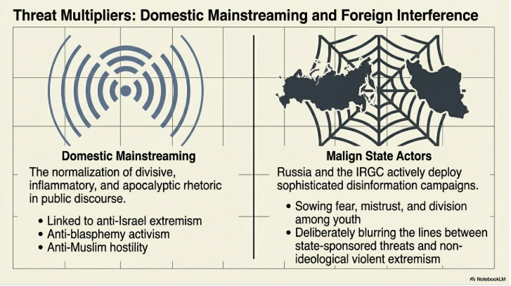 The Committee warns that malign state actors, specifically naming Russia and Iran’s Islamic Revolutionary Guard Corps (IRGC), are actively using disinformation to “sow fear, mistrust and division, targeting young people in particular and blurring the lines between state threats, terrorism and non-ideologically motivated violent extremism.”