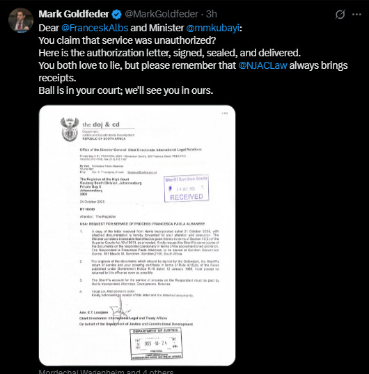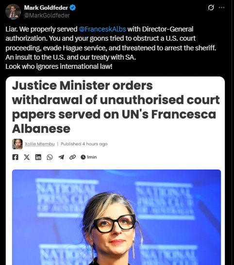 Update (October 27, 2025): After the publication of this article, Goldfeder posted documentation on X showing an authorization letter dated October 24, 2025, from South Africa’s Office of the Director-General: Chief Directorate: International Legal Affairs. The letter, stamped “RECEIVED” on October 25, 2025, appears to authorize the service request for “FRANCESCA ELSA ALBANESE” by the Sheriff at the location which she was speaking.