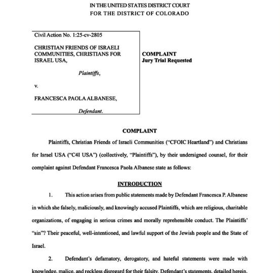 According to the complaint, the campaign began on April 24, 2025, when Albanese sent confidential letters to both organizations. In these letters, she accused them of: