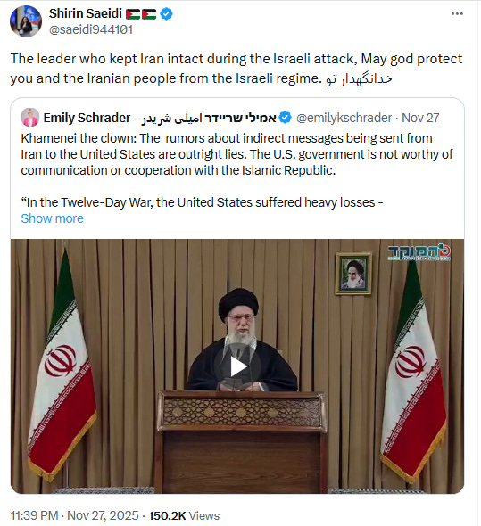 In posts shared on X (formerly Twitter) in late November, Saeidi defended the IRGC, praised Iran’s Supreme Leader Ali Khamenei, and offered prayers for his protection. In a November 27 post, Saeidi wrote: “The leader who kept Iran intact during the Israeli attack, May god protect you.”