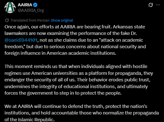 While Saeidi has previously invoked academic freedom in response to criticism, activists and experts argue that her statements cross the line from scholarly analysis into advocacy for a regime designated by the U.S. government as a state sponsor of terrorism.